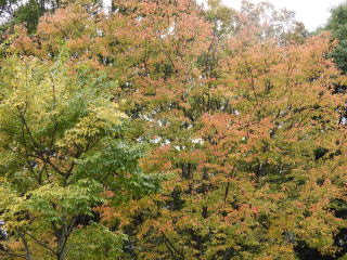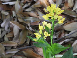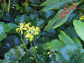 アオノクマタケランが、林床のあちこちで赤い実をつけている。ツワブキの黄色い花も目を引く(下の写真)。